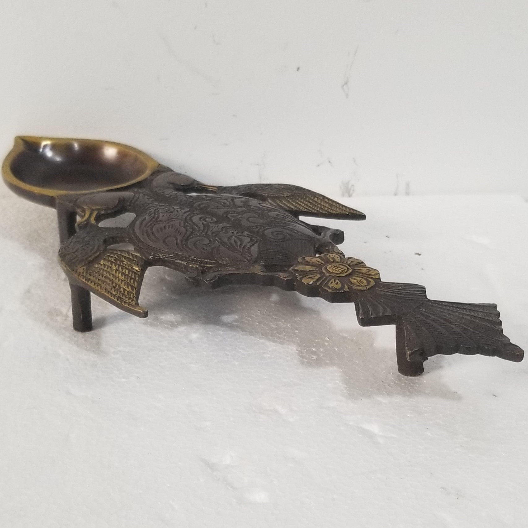 11.5"L x 5.5"W x 1"H - Handcrafted Brass Swan inspired Aarti Spoon. Oil lamps were a part of various traditions and cultures around the world, until electric lights became popular. The earliest known oil lamp can be dated back to the Chalcolithic Age, about 5320 years ago. Lighting an oil lamp at dawn and/or dusk is believed to be a symbol of enlightenment and brings about success and prosperity. In every Hindu home a lamp or diya is lit daily before a Hindu deity or any symbol associated with Hinduism or even at the altar