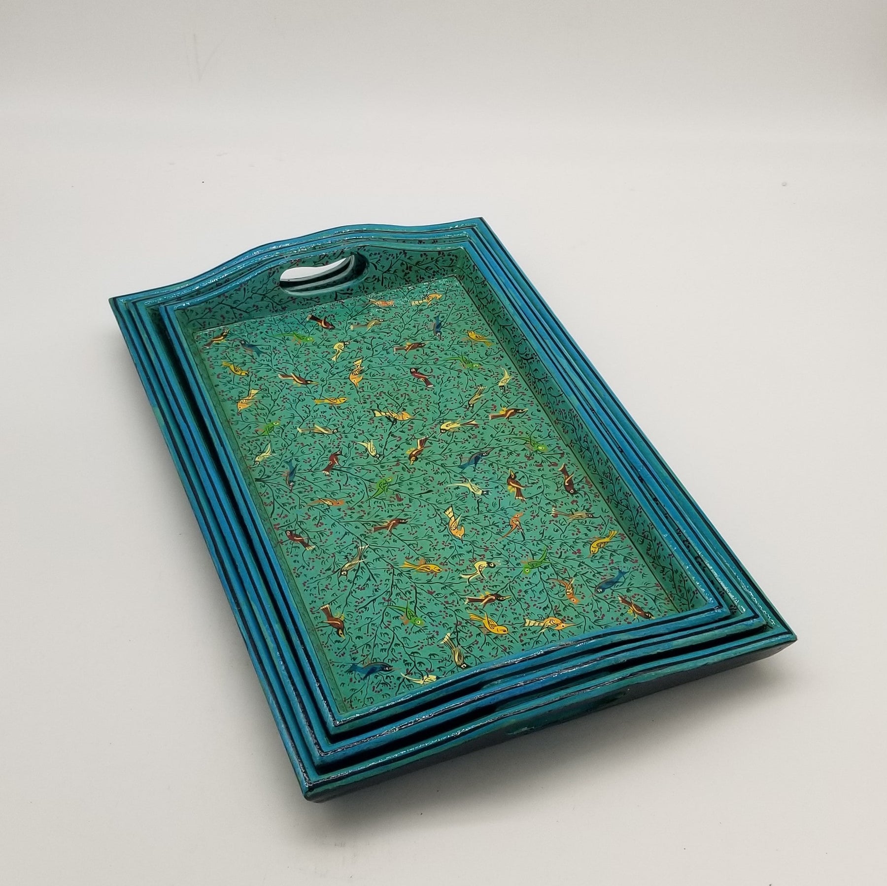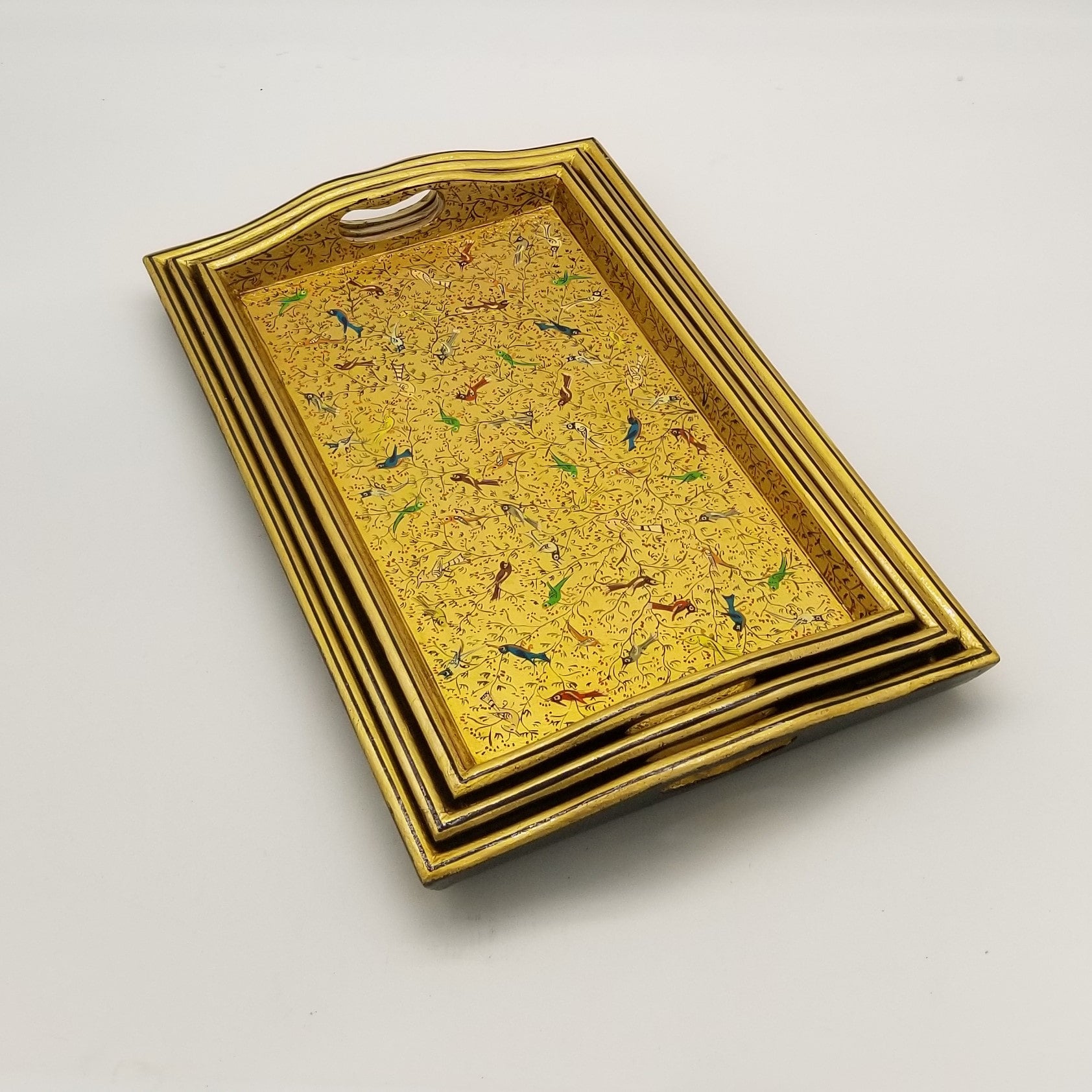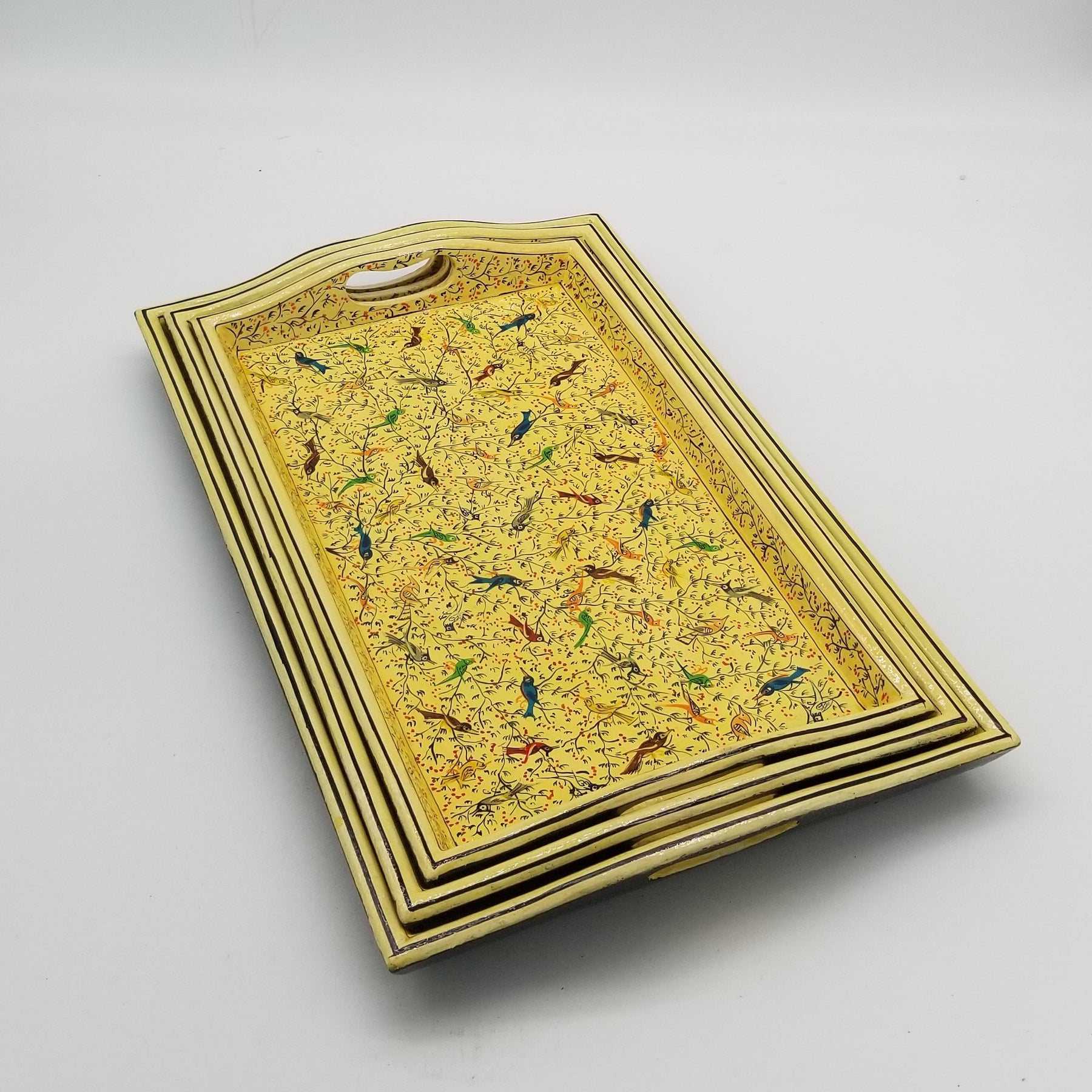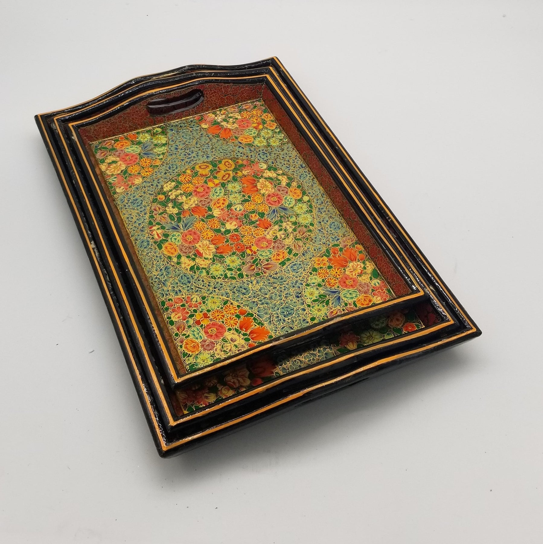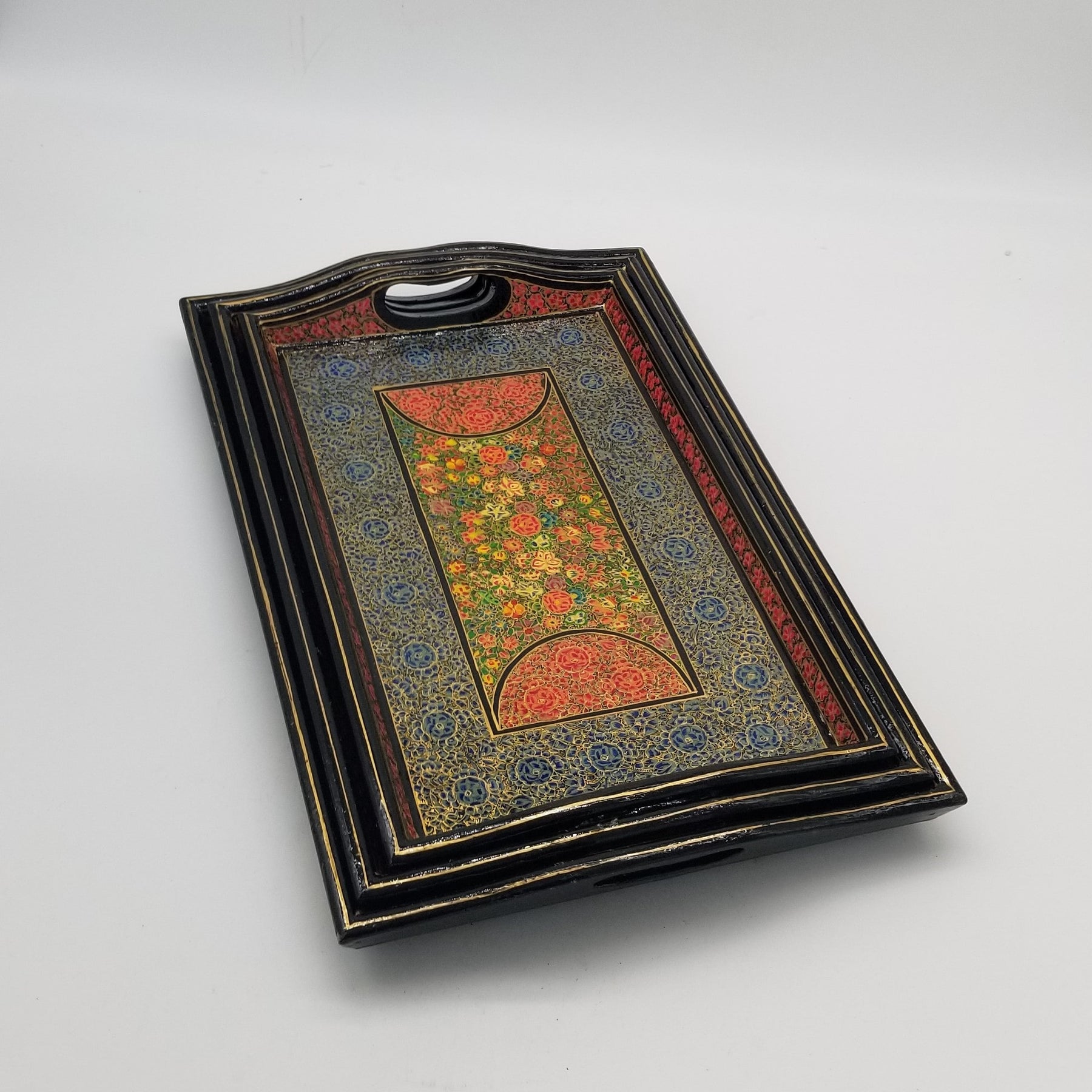 14"L x 9"W Assorted Wood and Papier Mache Serving Tray. Designed, handcrafted and hand painted by award wining Master Craftsmen from Kashmir this wood and papier mache combo trays are triple lacquered to give the sheen, grace and protection. This ornate exquisite Papier-Mache utility piece with its old world elegance and charm leaves one mesmerized by the fine, intricate painting that adorns it. The Papier-Mache art form originally from Persia, was initiated in Kashmir with the art of paper making and writing in the 15th century, during the reign of Badshah Zain-ul-Abedin in Kashmir.