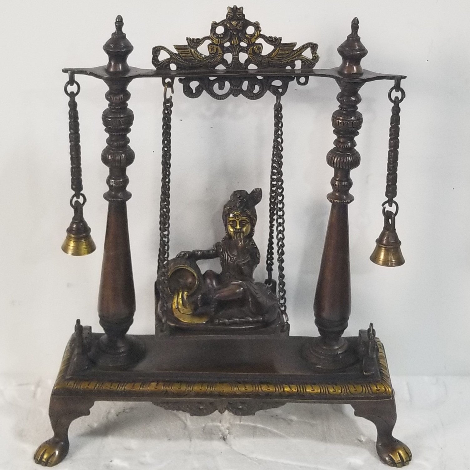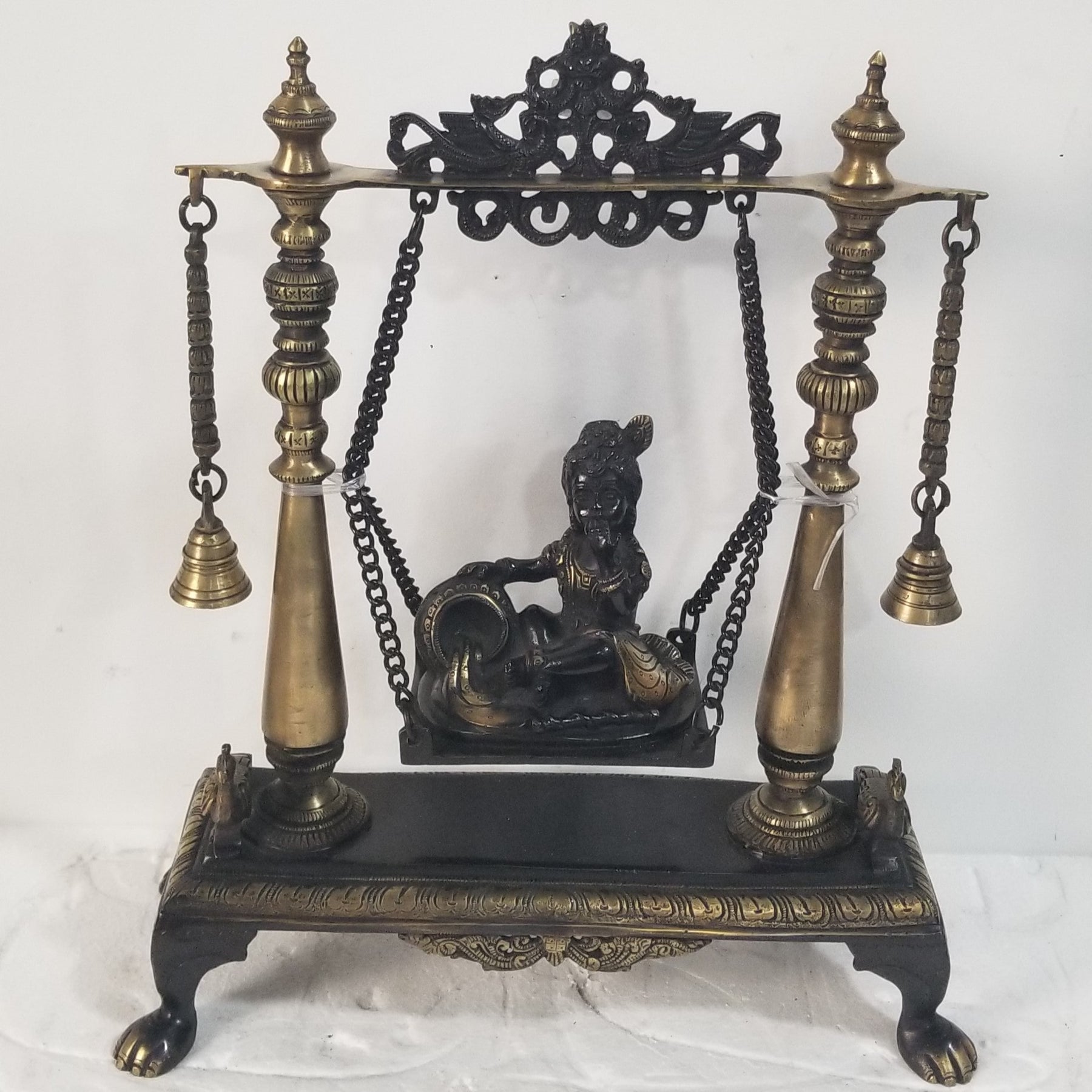 16"H x 13.5"W x 5.5"D - Handcrafted Brass Krishna on Swing/Jhoola. Shree Krishna’s Swing, also known as “Jhulan,” plays a central role in Hindu festivals like Janmashtami, celebrating Lord Krishna’s birth anniversary. Unravel the mystical tale of Vrindavan, where the young Krishna joyfully swayed on swings with Radha and the gopis. Adorned with fragrant flowers and intricate decorations, the divine swing symbolizes beauty and delight