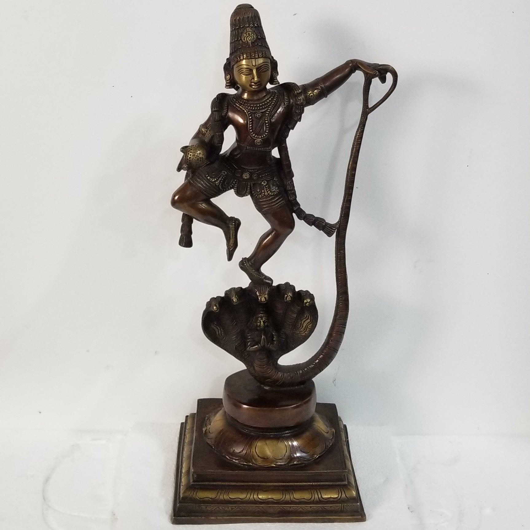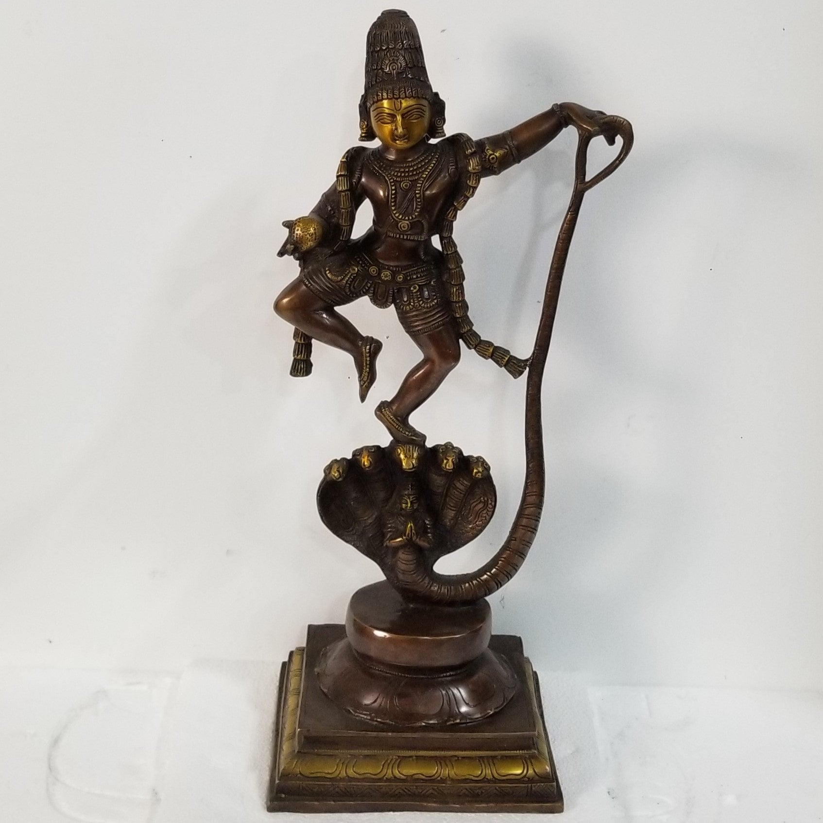 20.5"H x 8"W x 7"D - Handcrafted Brass Krishna dancing on snake Kaliya Head. The celestial dance of Sri Krishna on the head of the subdued Kaliya symbolizes the overcoming of desires