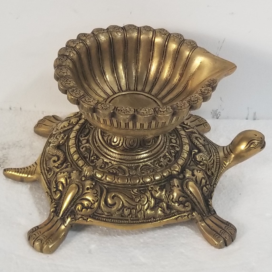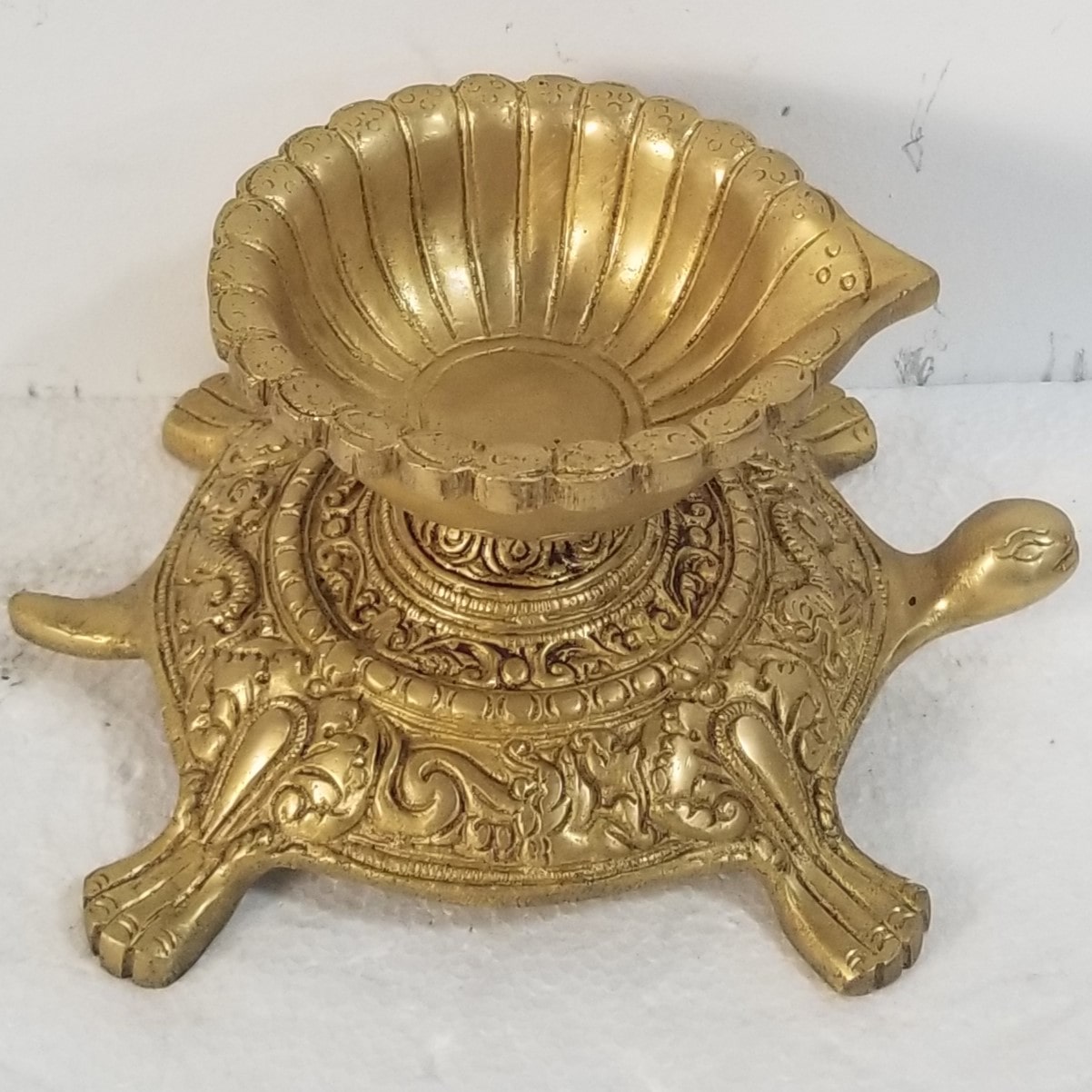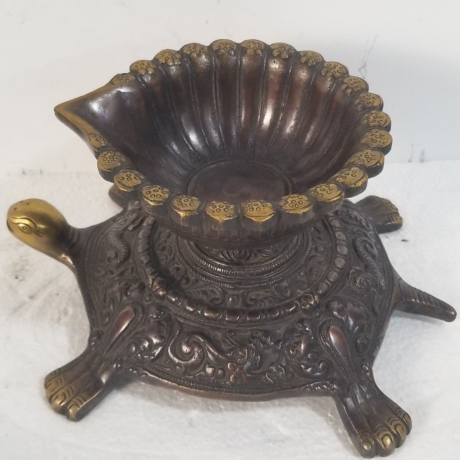 4"H x 6.5"W x 7.5"L - Handcrafted Tortoise inspired Brass Oil Lamp. Lighting an oil lamp at dawn and/or dusk is believed to be a symbol of enlightenment and brings about success and prosperity. In every Hindu home a lamp or diya is lit daily before a Hindu deity or any symbol associated with Hinduism or even at the altar