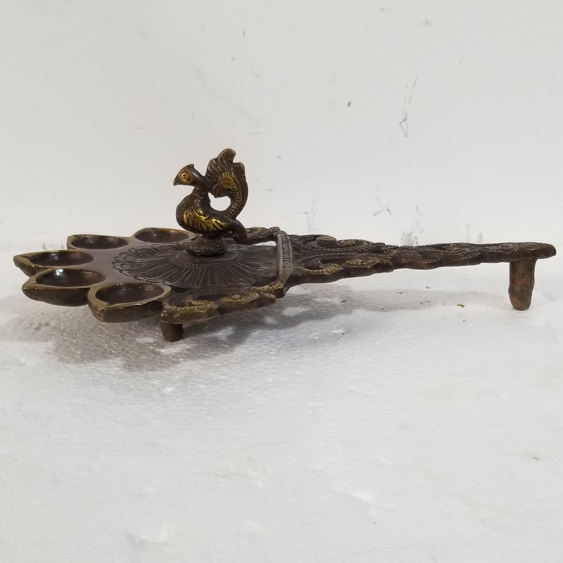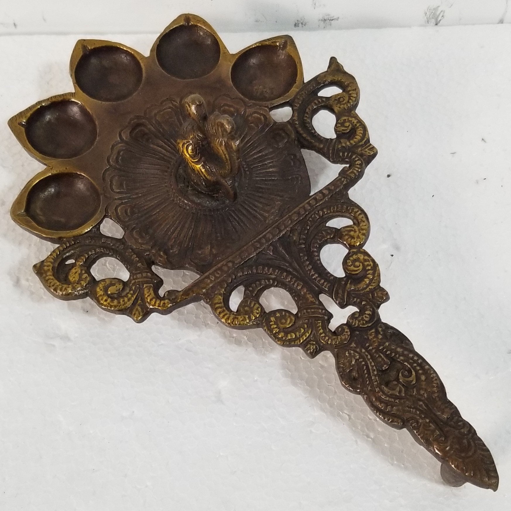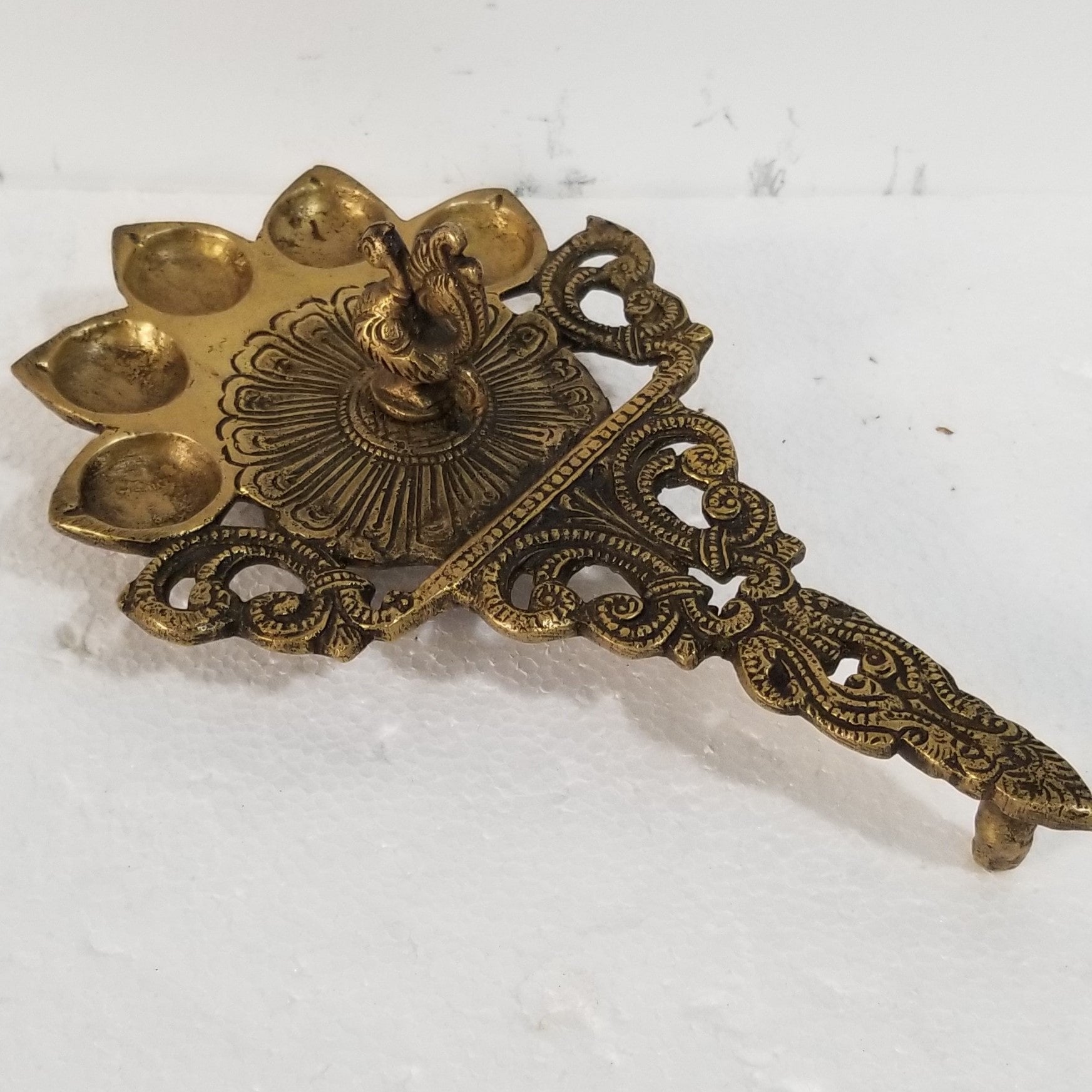 8"L x 5"W x 2.5"H - Handcrafted Peacock inspired 5 headed aarti spoon. Lighting the Lamp meaning is to be in total surrender to Divine/God and burn away our ego and negativity. Lighting Oil Lamp at home, in Puja Altar, reminds us that God is the only truth. The flame signifies knowledge that dispels the darkness of the mind and illuminates our path.