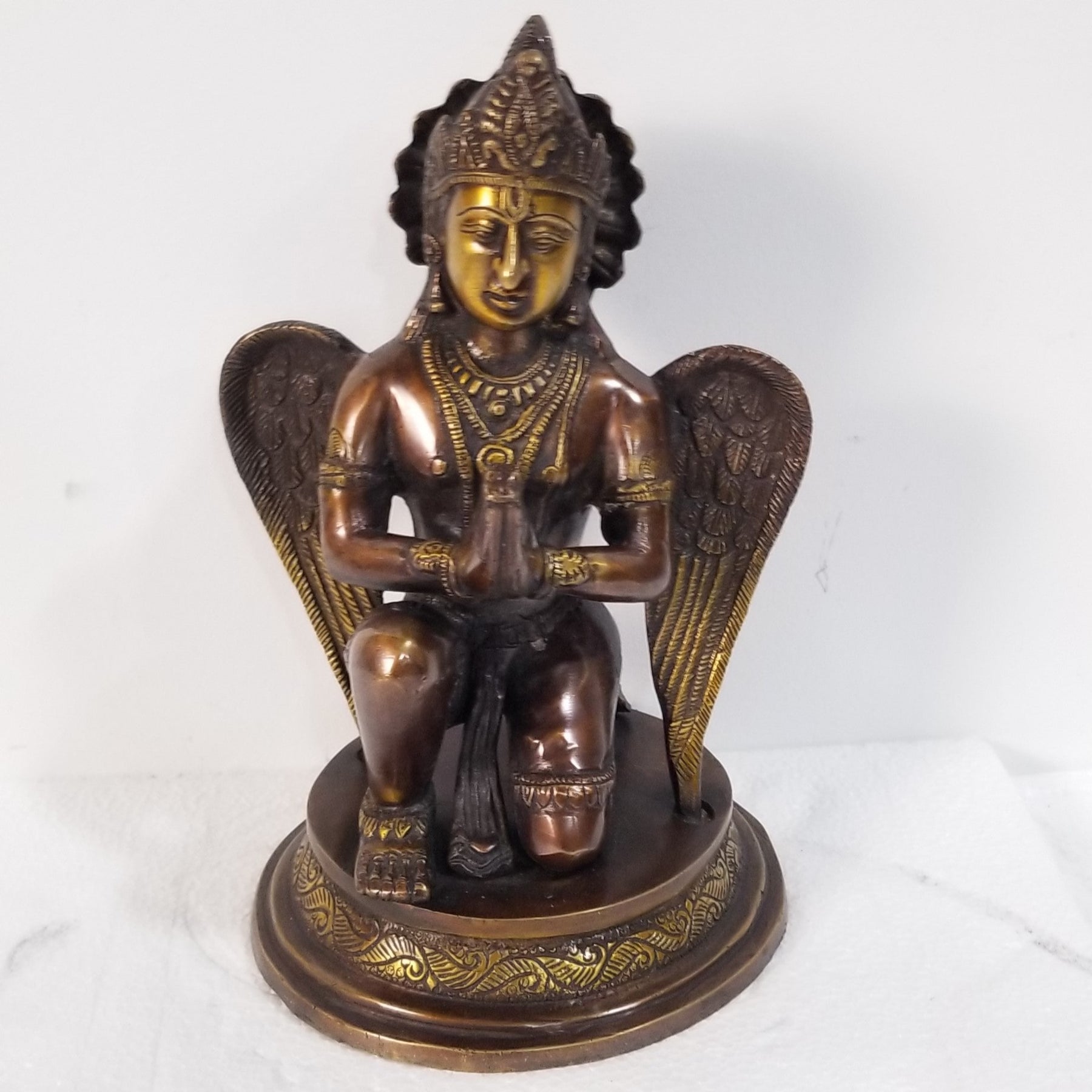 9"H x 5"W x 6"D Handcrafted Brass Garuda. Garuda is generally portrayed as a protector with the power to swiftly travel anywhere, ever vigilant and an enemy of every serpent. He is also known as Tarkshya and Vainateya. Garuda is a part of state insignia of India, Indonesia and Thailand